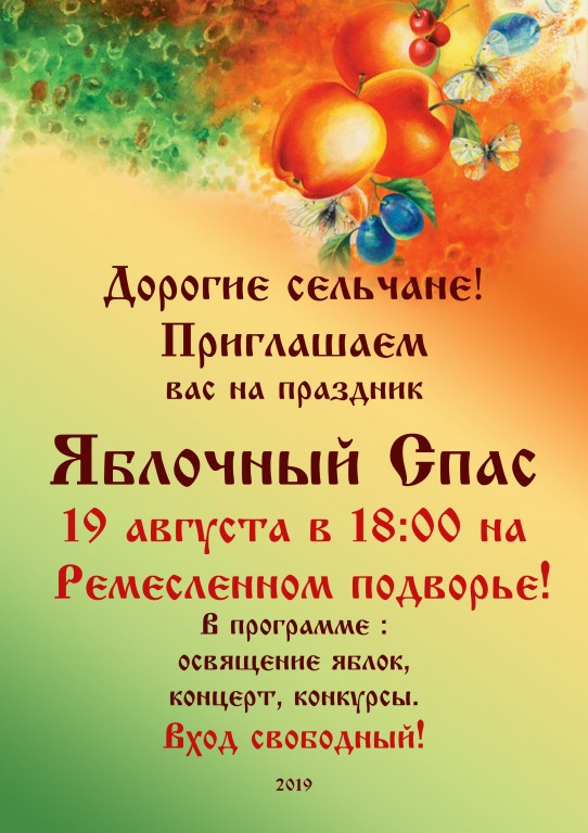 Дорогие сельчане!  Приглашаем вас на праздник  Яблочный Спас на Ремесленном подворье 19 августа в 18:00