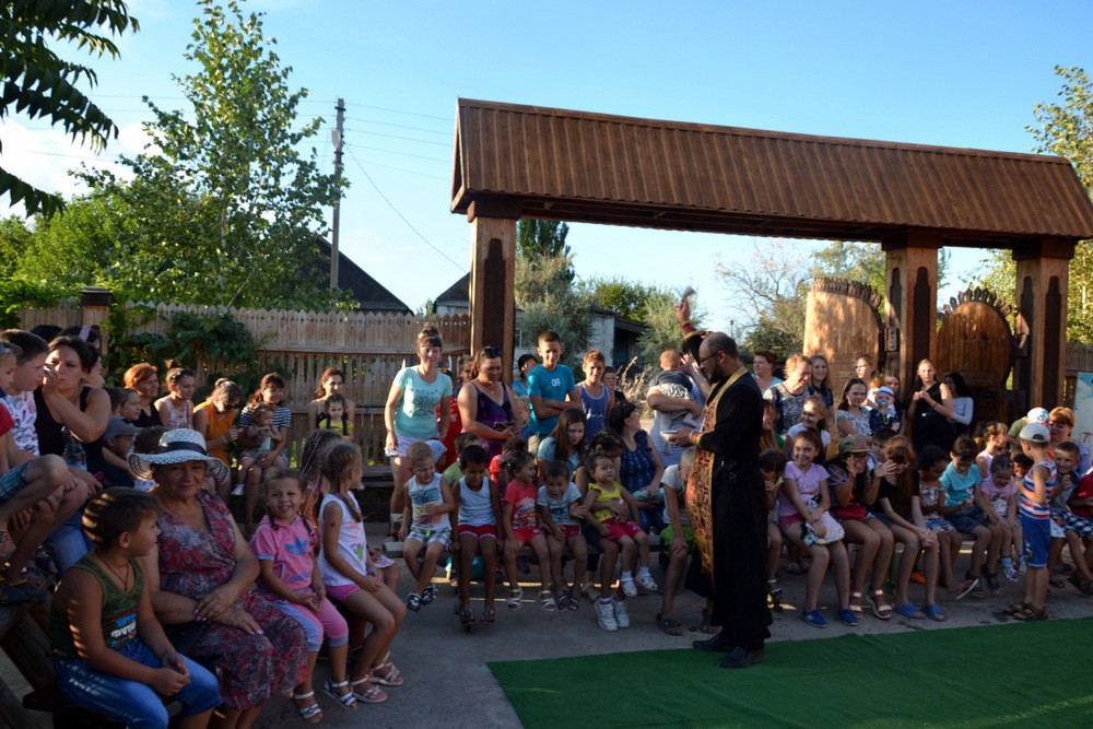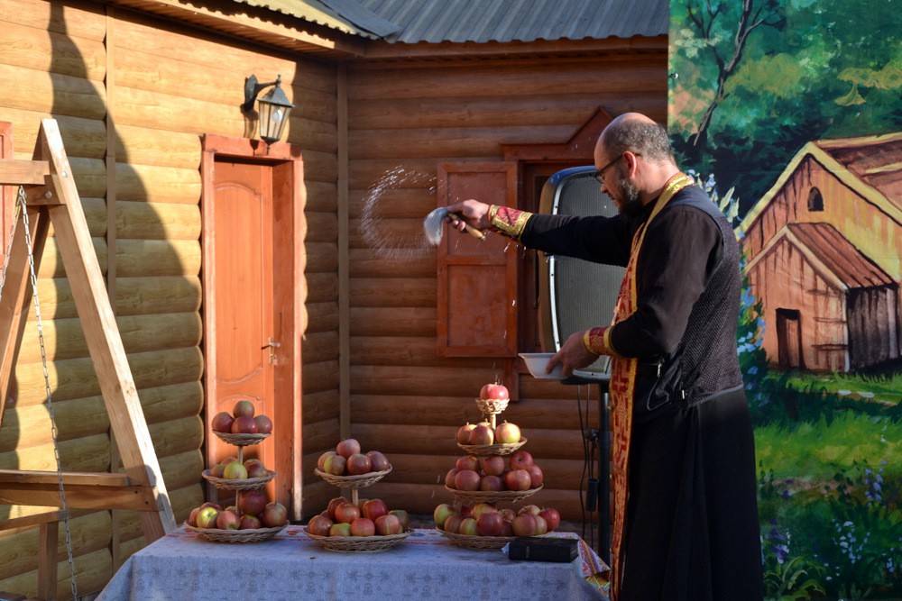 Ведущая поздравила всех собравшихся со всенародно любимым праздником; священник отец Давид по традиции освятил яблоки.