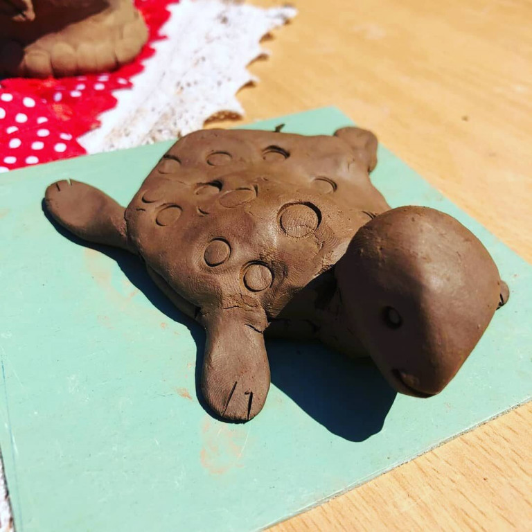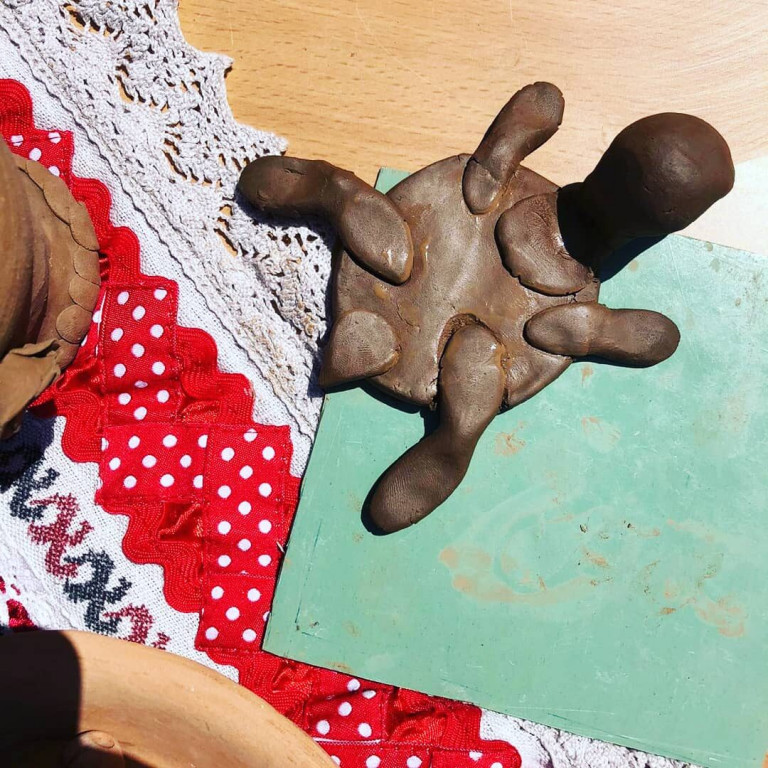 Следующий шаг. Нам необходимо приклеить верхнюю часть панциря, для этого мы её немного изгибаем горкой и промазываем шликером. Края аккуратно прижимаем к нижней части. На мордочке делаем ротик и глазки, на панцире делаем орнамент в виде кружочков, на лапках делаем надрезы-пальцы.