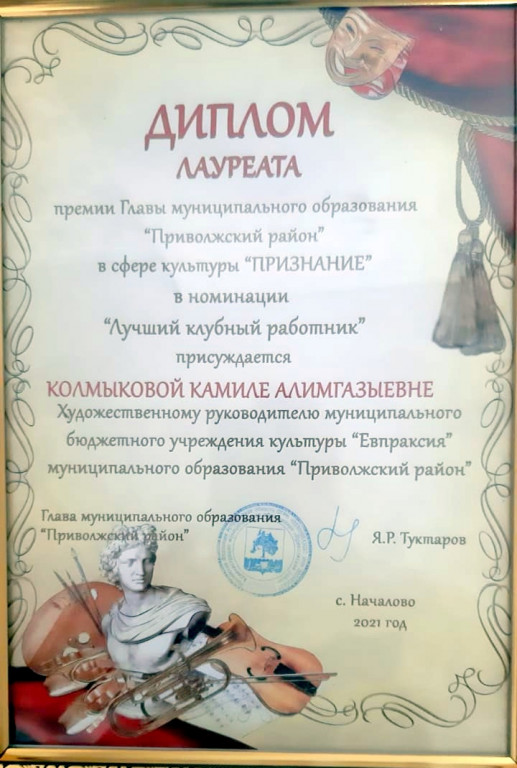 «Приволжский район» в сфере культуры «Признание». В номинации «Лучший клубный работник» награждена художественный