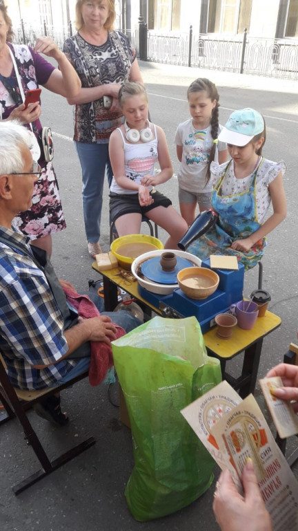 На гончарном круге из евпраксинской глины вертелись, крутились всевозможные стаканчики и вазочки. Рядом мастерица раскрывала секреты валяния, детки терли и катали шерсть. Наматывались ниточки и завязывались узелки на мастер-классе по созданию обереговой куклы. А некоторые ребятишки и взрослые узнавали тонкости росписи глиняных изделий.