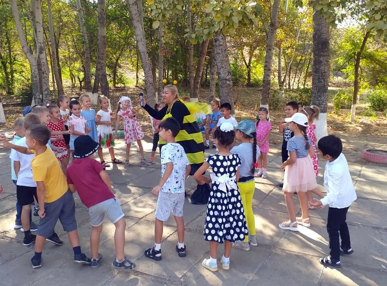 Пчелки Майя, Жужа и шмель Вилли играли с ребятишками в подвижные игры. Дети отвечали