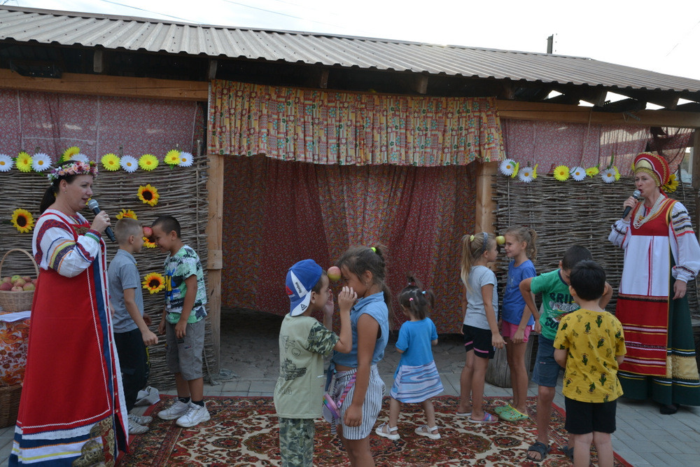 Под задорные песни, игры и забавы гости мероприятия познакомились с историей праздника, узнали, что на Яблочный Спас принято печь яблочные пироги и пить яблочный компот, а также освящать в церкви яблоки и другие фрукты.