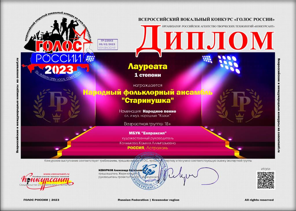 Народный фольклорный ансамбль "Старинушка" принял участие во Всероссийском вокальном конкурсе "Голос России" с народной песней Казак в номинации "Народное пение".