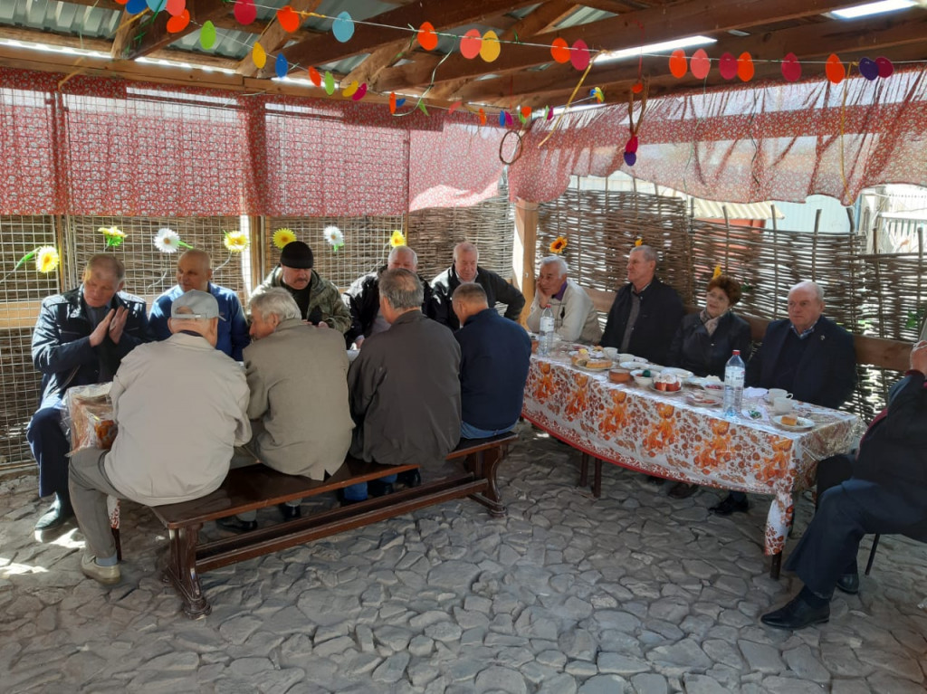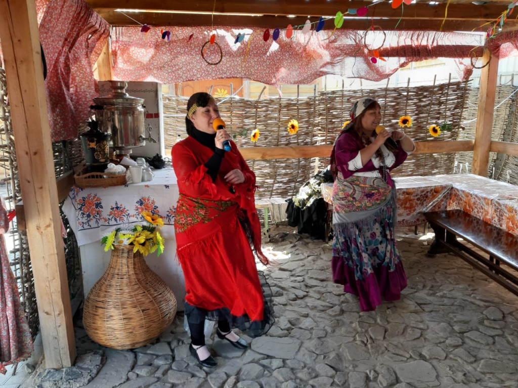Под навесом на свежем воздухе гости пили чай и слушали народные песни в исполнении ансамбля "Старинушка"
