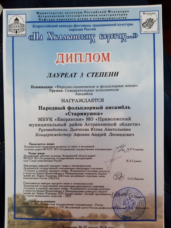 Компетентное жюри по достоинству оценило исполнительское искусство артисток, наградив ансамбль "Старинушка" дипломом Лауреата 3 степени.