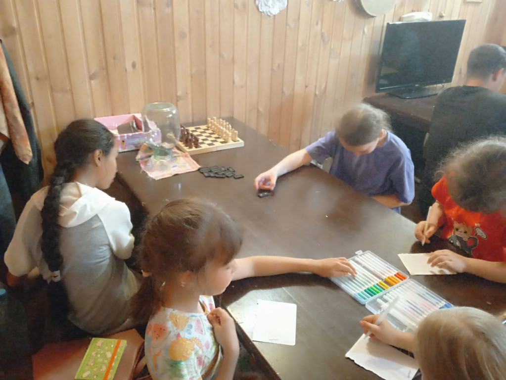 Участники — и взрослые, и дети — с энтузиазмом играли в настольный теннис, шахматы, домино и другие игры. Для девочек была организована отдельная зона, где они с удовольствием рисовали, раскрывая свои творческие таланты.