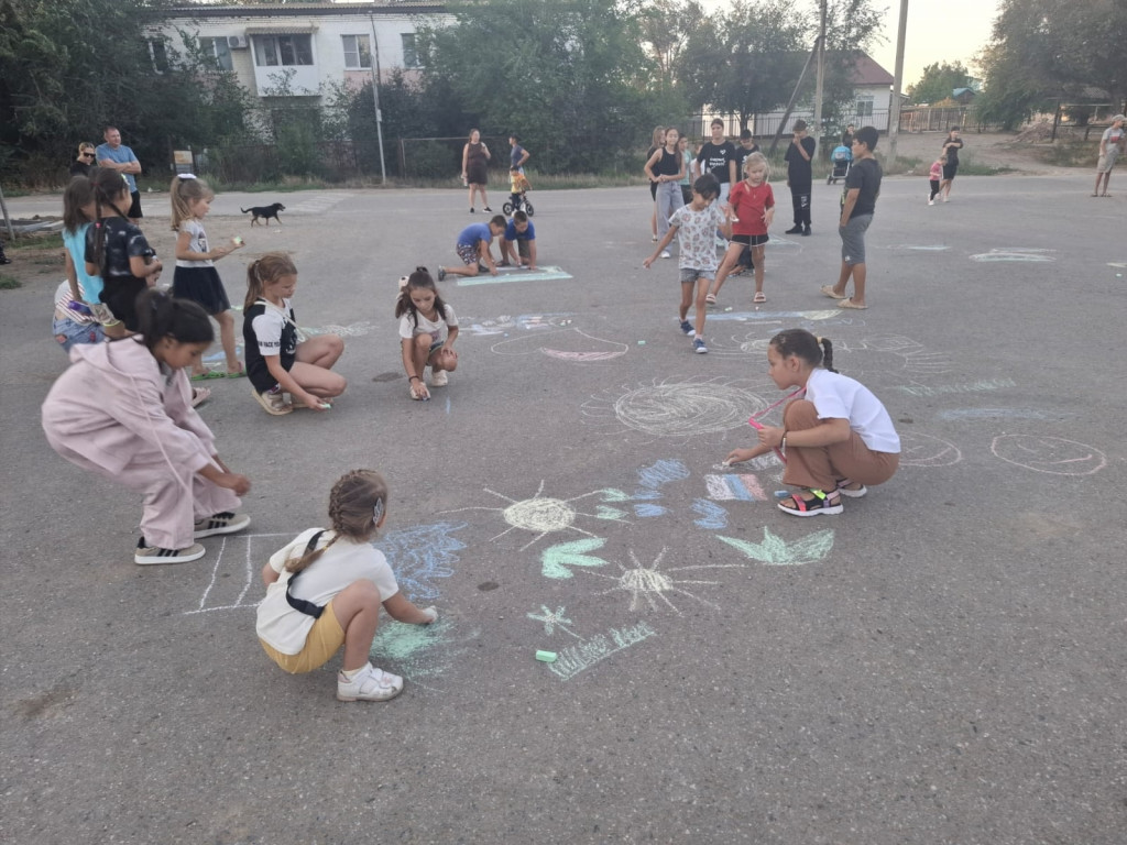 Праздник начался с детских рисунков на асфальте, тема конкурса: «Лето в каждом рисунке», участники были отмечены сладкими призами.