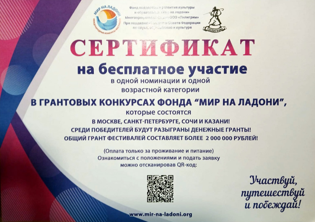 сертификатом на бесплатное участие в грантовых конкурсах фонда «Мир на ладони».